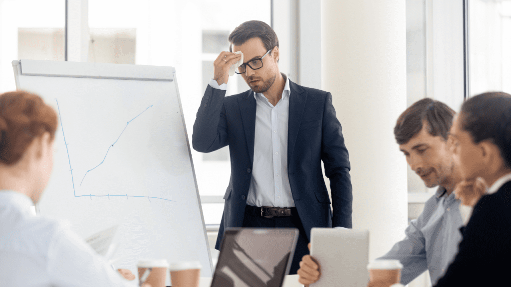 Homem de terno, com expressão preocupada, enxuga a testa diante de um quadro com gráfico enquanto colegas trabalham ao redor.