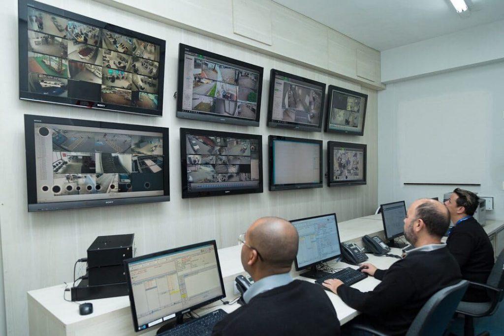 Sala de monitoramento com três pessoas acompanhando câmeras de segurança em vários monitores, representando a gestão condominial e o controle remoto de acesso.